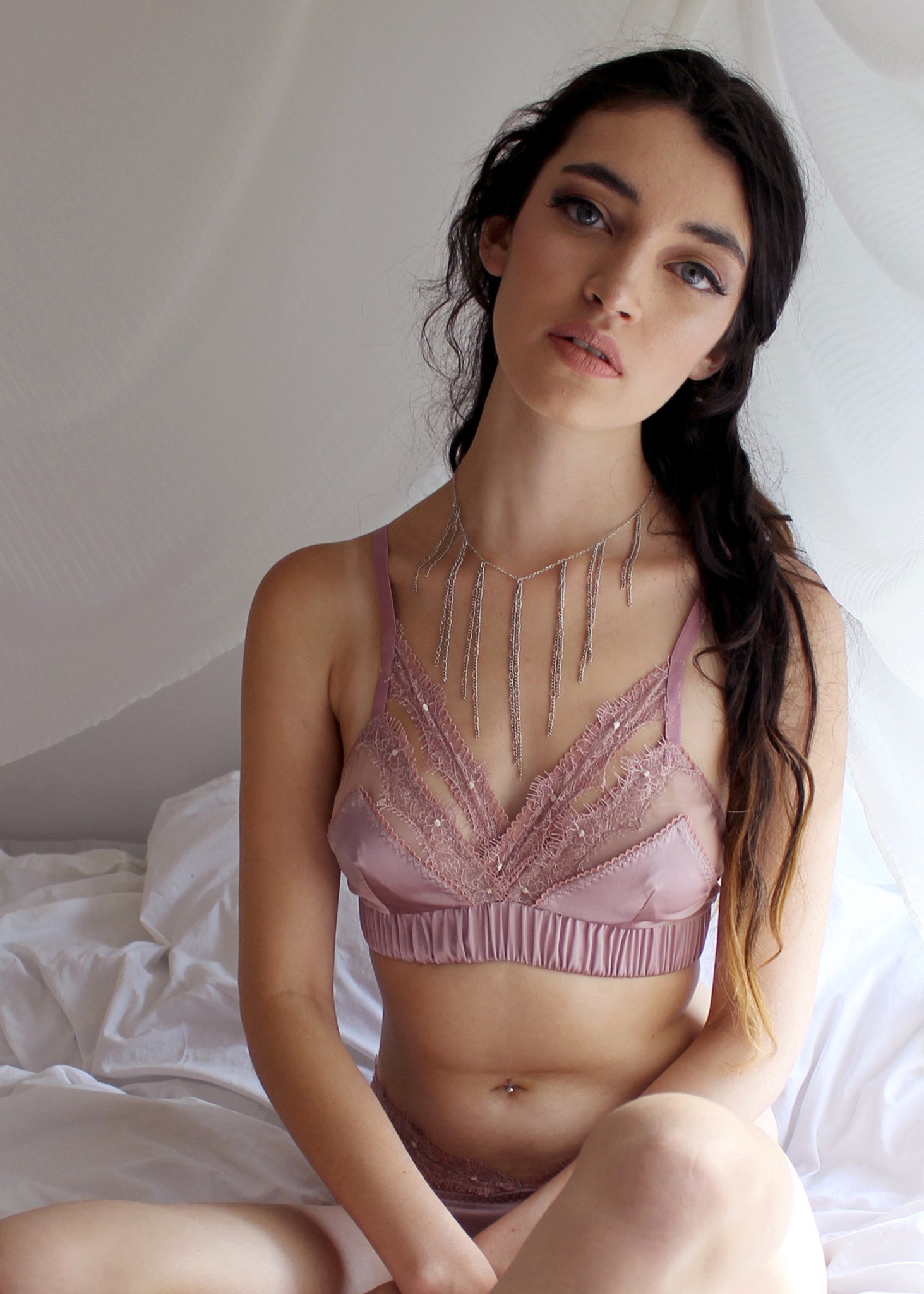 Uye Surana is known for its dreamy extra strappy designs which really don’t have a bondage vibe. Actually, this brand has one of the most romantic aesthetic I have come across (not saying that bondage can’t be romantic but you got me), It is all about soft lights and colors, polaroid pictures, flowers and girl power. They feature models of all size and ethnicity and use beautiful fabrics and material. I am really into their suspender belts which are rather original and the wide underbreast elastics on some of their bralettes. I would love to see how they really fit as they offer cup sized bralettes.