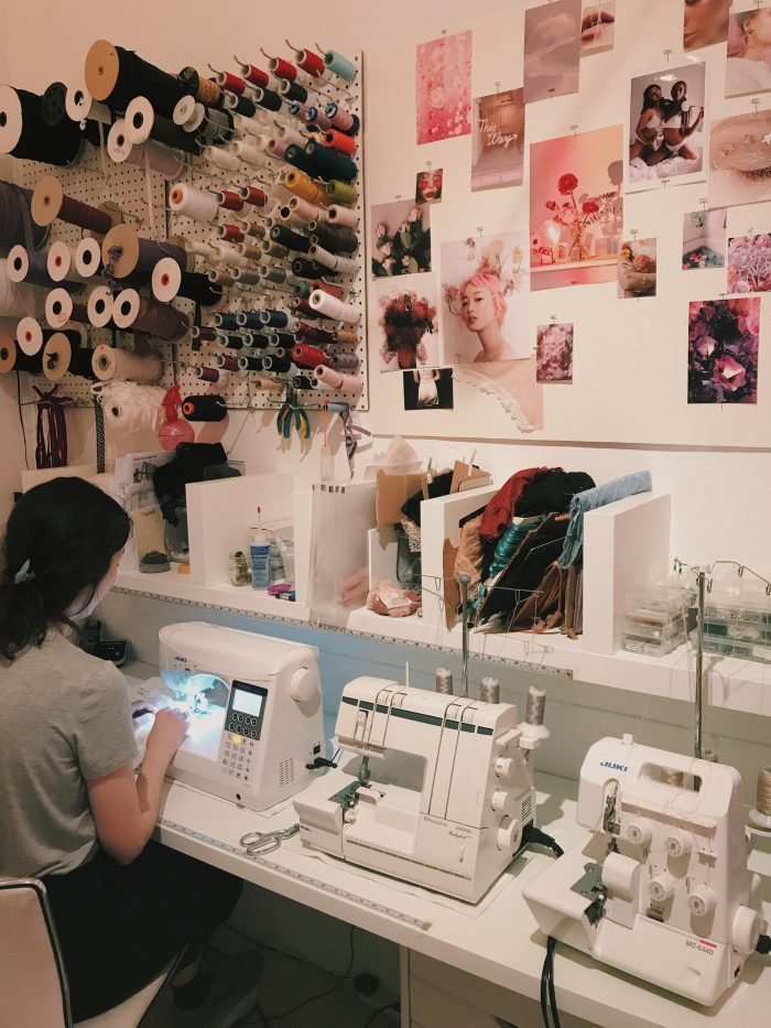 Monica is based in New-York and everything she sells is carefully crafted by her team, composed of her and second seamstress. I really love the atmosphere in her studio. It definitely fits with the image I have of the brand. A very soft, dreamy aesthetic. Pastel colors, stones, and cute jars of scented oil that give you nice witchery vibes…