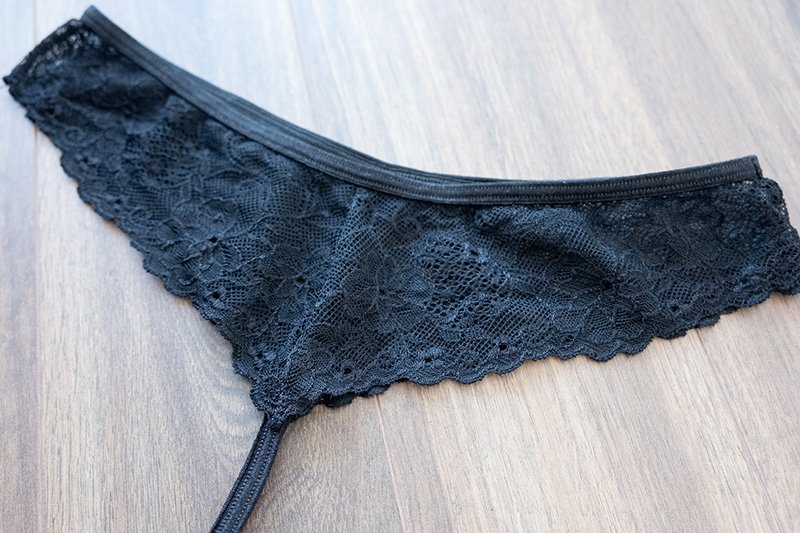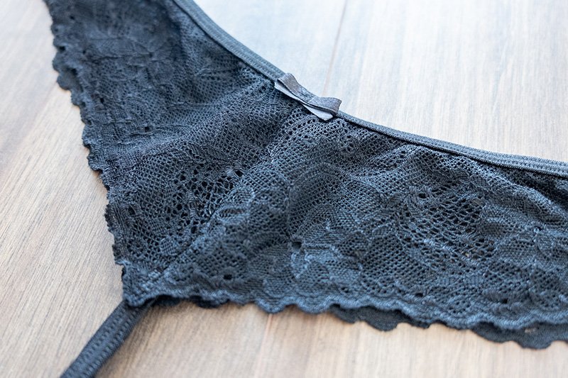 So, I received the T-front g-string – lace in black and size Medium. The thong is made of very stretchy lace and elastics and features a small satin ribbon at the front. The floral lace used for this product is quite easy to match with many black bras, as it’s very dense and discreet, so I paired it with my Comexim Bellissima bra.