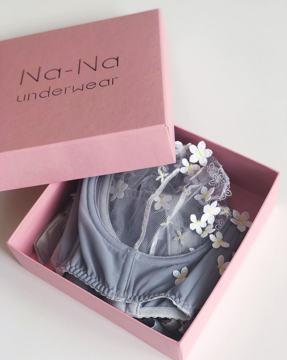 Ukranian brand Nana underwear is well-known in the Instagram lingerie community for their Marie-Antoinette set ( right bottom side of the picture). This brand like many others in a one-woman operation and always aims for improvement. The sizing system is European and according to their size chart, I would be a 65H or 70G which seems to be similar to my Avocado lingerie size. I only wish they would go up to an H cup in the designs I like the mosts, such as the Marie-Antoinette and Chérie bra (featured in the gift box). These ones only go up to a C cup. I would say that this is the tragedy of Instagram independent designers, the sizing is often very limited while the designs are usually super lovely and have nothing to envy to what we’d find in regular stores.